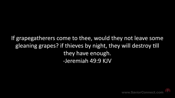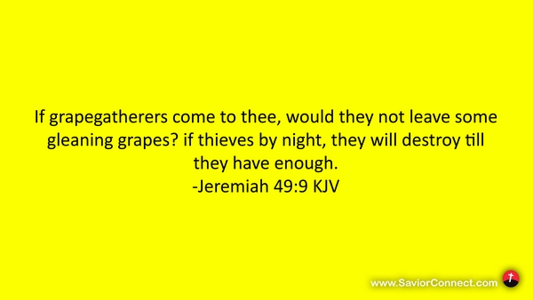 If grapegatherers come to thee, would they not leave some gleaning grapes? if thieves by night, they will destroy till they have enough. -Jeremiah 49:9 KJV