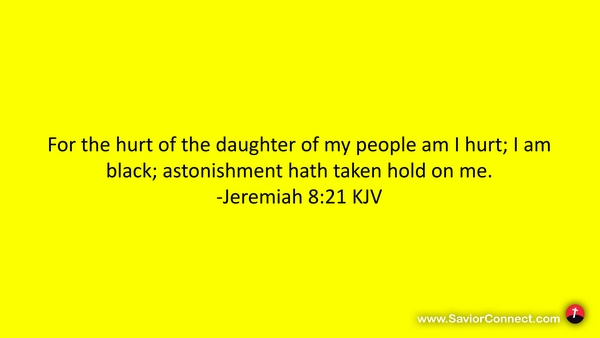 For the hurt of the daughter of my people am I hurt; I am black; astonishment hath taken hold on me. -Jeremiah 8:21 KJV