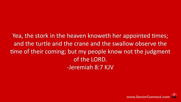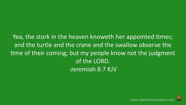 Yea, the stork in the heaven knoweth her appointed times; and the turtle and the crane and the swallow observe the time of their coming; but my people know not the judgment of the LORD. -Jeremiah 8:7 KJV