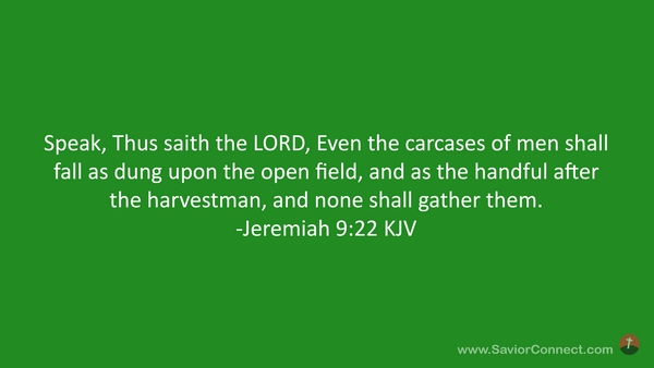 Speak, Thus saith the LORD, Even the carcases of men shall fall as dung upon the open field, and as the handful after the harvestman, and none shall gather them. -Jeremiah 9:22 KJV