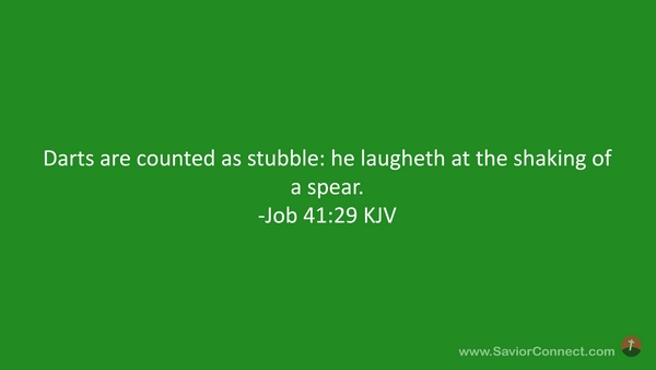 Darts are counted as stubble: he laugheth at the shaking of a spear. -Job 41:29 KJV