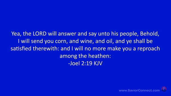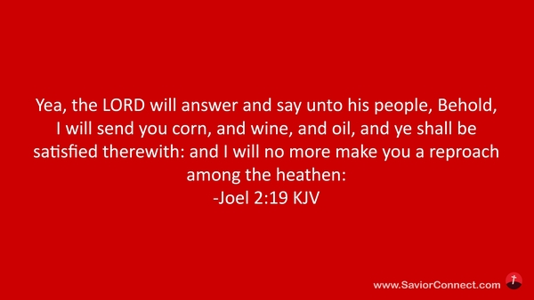 Yea, the LORD will answer and say unto his people, Behold, I will send you corn, and wine, and oil, and ye shall be satisfied therewith: and I will no more make you a reproach among the heathen: -Joel 2:19 KJV