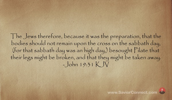 The Jews therefore, because it was the preparation, that the bodies should not remain upon the cross on the sabbath day, (for that sabbath day was an high day,) besought Pilate that their legs might be broken, and that they might be taken away. -John 19:31 KJV