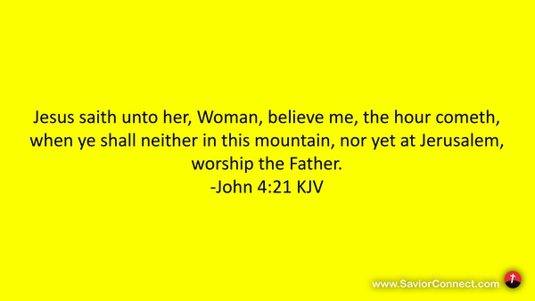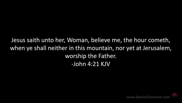 Jesus saith unto her, Woman, believe me, the hour cometh, when ye shall neither in this mountain, nor yet at Jerusalem, worship the Father. -John 4:21 KJV