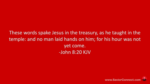 These words spake Jesus in the treasury, as he taught in the temple: and no man laid hands on him; for his hour was not yet come. -John 8:20 KJV