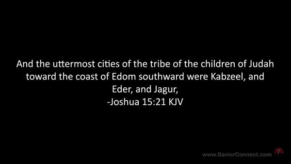 And the uttermost cities of the tribe of the children of Judah toward the coast of Edom southward were Kabzeel, and Eder, and Jagur, -Joshua 15:21 KJV