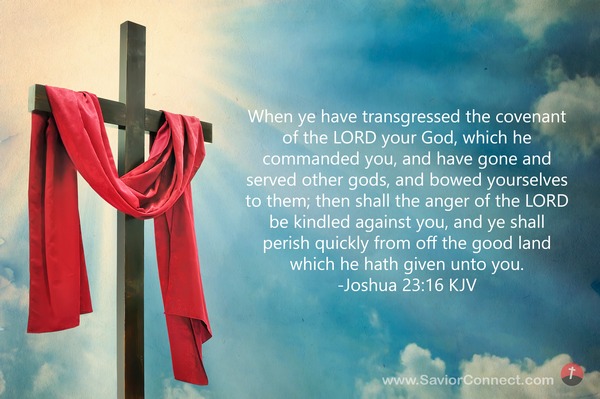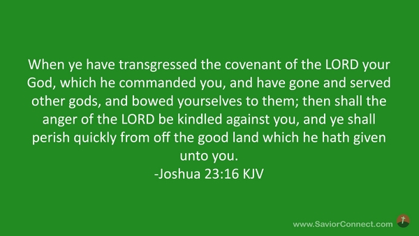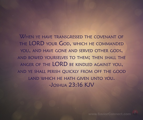 When ye have transgressed the covenant of the LORD your God, which he commanded you, and have gone and served other gods, and bowed yourselves to them; then shall the anger of the LORD be kindled against you, and ye shall perish quickly from off the good land which he hath given unto you. -Joshua 23:16 KJV
