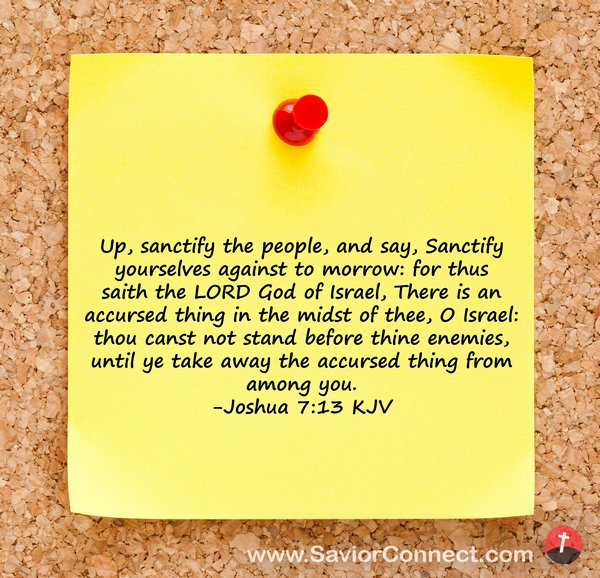 Up, sanctify the people, and say, Sanctify yourselves against to morrow: for thus saith the LORD God of Israel, There is an accursed thing in the midst of thee, O Israel: thou canst not stand before thine enemies, until ye take away the accursed thing from among you. -Joshua 7:13 KJV