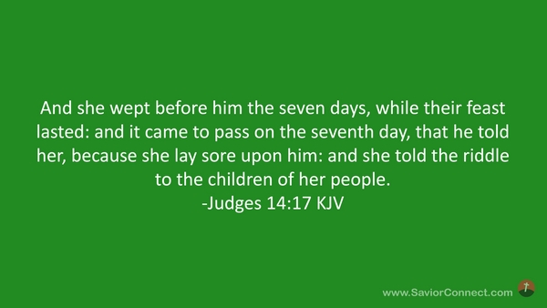 And she wept before him the seven days, while their feast lasted: and it came to pass on the seventh day, that he told her, because she lay sore upon him: and she told the riddle to the children of her people. -Judges 14:17 KJV