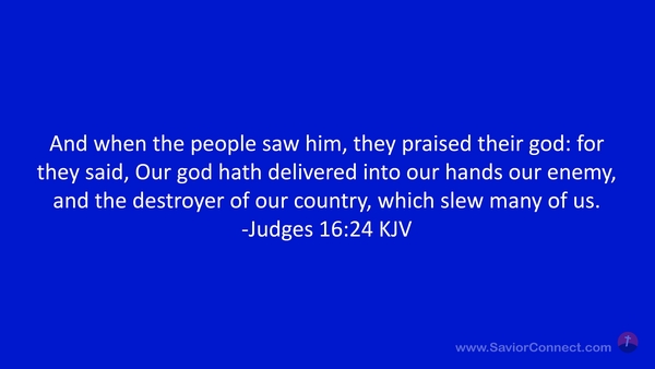 And when the people saw him, they praised their god: for they said, Our god hath delivered into our hands our enemy, and the destroyer of our country, which slew many of us. -Judges 16:24 KJV
