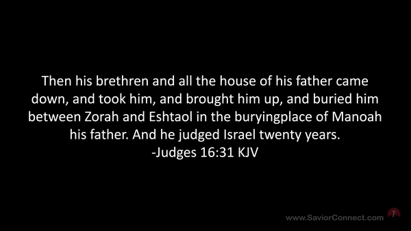 Then his brethren and all the house of his father came down, and took him, and brought him up, and buried him between Zorah and Eshtaol in the buryingplace of Manoah his father. And he judged Israel twenty years. -Judges 16:31 KJV