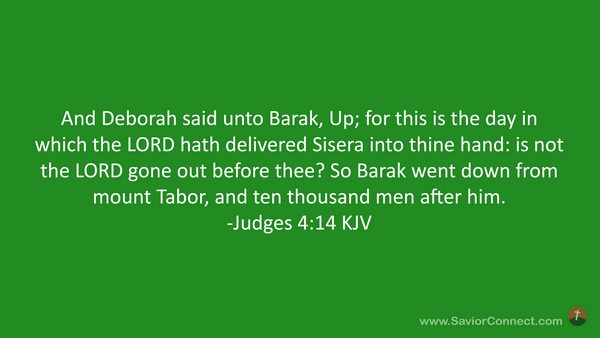 And Deborah said unto Barak, Up; for this is the day in which the LORD hath delivered Sisera into thine hand: is not the LORD gone out before thee? So Barak went down from mount Tabor, and ten thousand men after him. -Judges 4:14 KJV