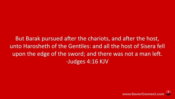 But Barak pursued after the chariots, and after the host, unto Harosheth of the Gentiles: and all the host of Sisera fell upon the edge of the sword; and there was not a man left. -Judges 4:16 KJV