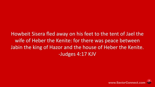 Howbeit Sisera fled away on his feet to the tent of Jael the wife of Heber the Kenite: for there was peace between Jabin the king of Hazor and the house of Heber the Kenite. -Judges 4:17 KJV