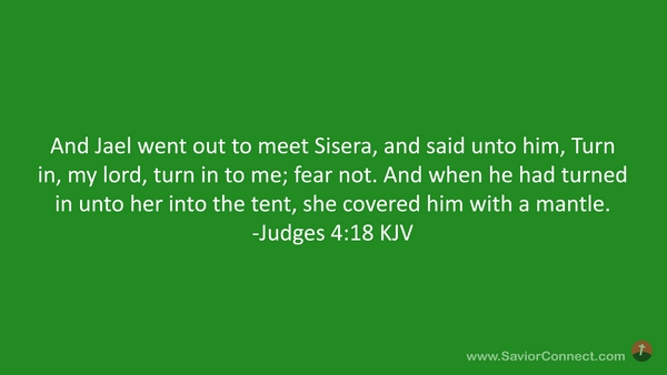And Jael went out to meet Sisera, and said unto him, Turn in, my lord, turn in to me; fear not. And when he had turned in unto her into the tent, she covered him with a mantle. -Judges 4:18 KJV