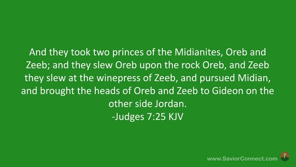 And they took two princes of the Midianites, Oreb and Zeeb; and they slew Oreb upon the rock Oreb, and Zeeb they slew at the winepress of Zeeb, and pursued Midian, and brought the heads of Oreb and Zeeb to Gideon on the other side Jordan. -Judges 7:25 KJV