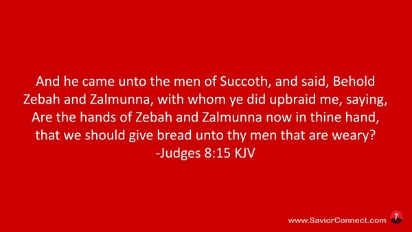 And he came unto the men of Succoth, and said, Behold Zebah and Zalmunna, with whom ye did upbraid me, saying, Are the hands of Zebah and Zalmunna now in thine hand, that we should give bread unto thy men that are weary? -Judges 8:15 KJV