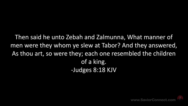 Then said he unto Zebah and Zalmunna, What manner of men were they whom ye slew at Tabor? And they answered, As thou art, so were they; each one resembled the children of a king. -Judges 8:18 KJV
