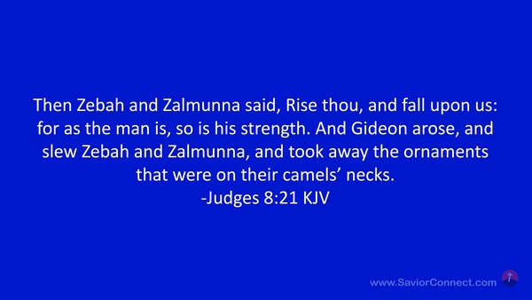 Then Zebah and Zalmunna said, Rise thou, and fall upon us: for as the man is, so is his strength. And Gideon arose, and slew Zebah and Zalmunna, and took away the ornaments that were on their camels' necks. -Judges 8:21 KJV
