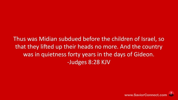 Thus was Midian subdued before the children of Israel, so that they lifted up their heads no more. And the country was in quietness forty years in the days of Gideon. -Judges 8:28 KJV
