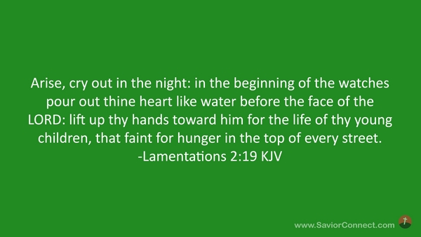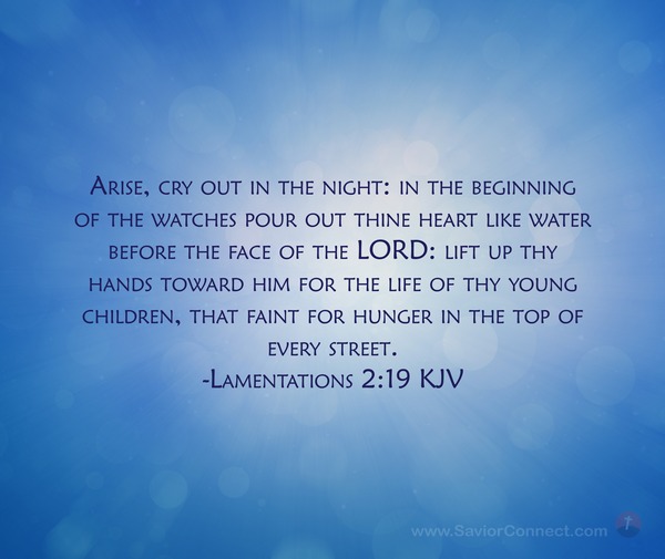 Arise, cry out in the night: in the beginning of the watches pour out thine heart like water before the face of the LORD: lift up thy hands toward him for the life of thy young children, that faint for hunger in the top of every street. -Lamentations 2:19 KJV