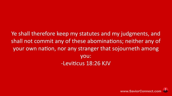 Ye shall therefore keep my statutes and my judgments, and shall not commit any of these abominations; neither any of your own nation, nor any stranger that sojourneth among you: -Leviticus 18:26 KJV