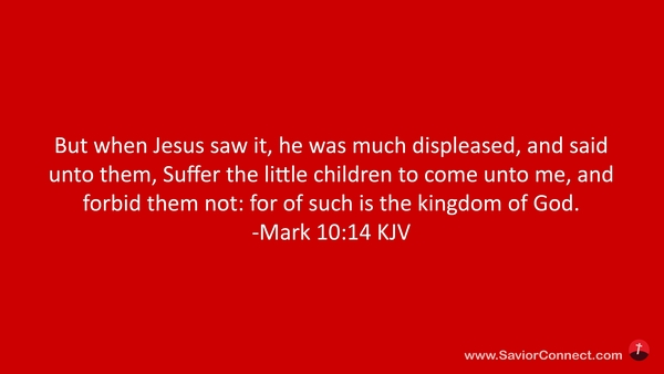 But when Jesus saw it, he was much displeased, and said unto them, Suffer the little children to come unto me, and forbid them not: for of such is the kingdom of God. -Mark 10:14 KJV