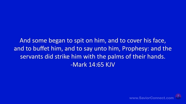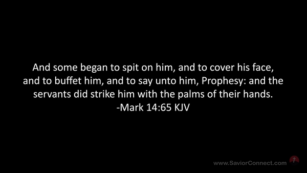 And some began to spit on him, and to cover his face, and to buffet him, and to say unto him, Prophesy: and the servants did strike him with the palms of their hands. -Mark 14:65 KJV