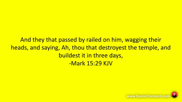 And they that passed by railed on him, wagging their heads, and saying, Ah, thou that destroyest the temple, and buildest it in three days, -Mark 15:29 KJV