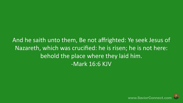 And he saith unto them, Be not affrighted: Ye seek Jesus of Nazareth, which was crucified: he is risen; he is not here: behold the place where they laid him. -Mark 16:6 KJV