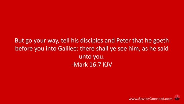 But go your way, tell his disciples and Peter that he goeth before you into Galilee: there shall ye see him, as he said unto you. -Mark 16:7 KJV