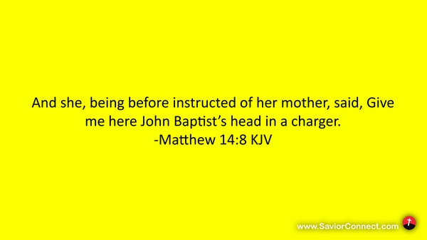 And she, being before instructed of her mother, said, Give me here John Baptist's head in a charger. -Matthew 14:8 KJV