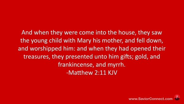 And when they were come into the house, they saw the young child with Mary his mother, and fell down, and worshipped him: and when they had opened their treasures, they presented unto him gifts; gold, and frankincense, and myrrh. -Matthew 2:11 KJV
