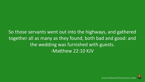 So those servants went out into the highways, and gathered together all as many as they found, both bad and good: and the wedding was furnished with guests. -Matthew 22:10 KJV