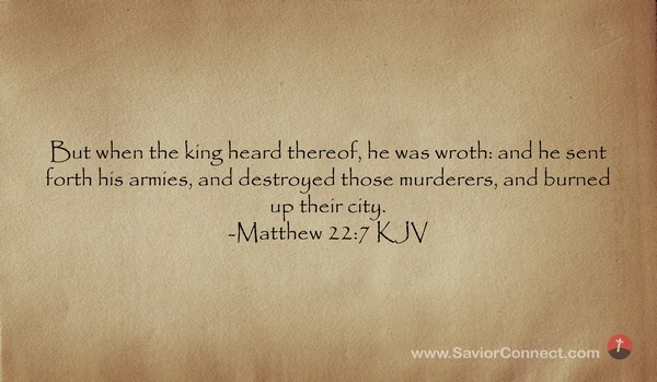 But when the king heard thereof, he was wroth: and he sent forth his armies, and destroyed those murderers, and burned up their city. -Matthew 22:7 KJV