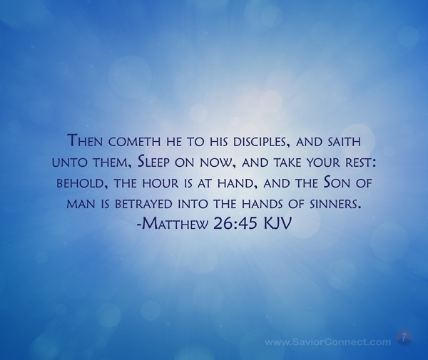 Then cometh he to his disciples, and saith unto them, Sleep on now, and take your rest: behold, the hour is at hand, and the Son of man is betrayed into the hands of sinners. -Matthew 26:45 KJV