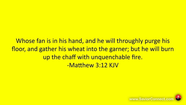Whose fan is in his hand, and he will throughly purge his floor, and gather his wheat into the garner; but he will burn up the chaff with unquenchable fire. -Matthew 3:12 KJV