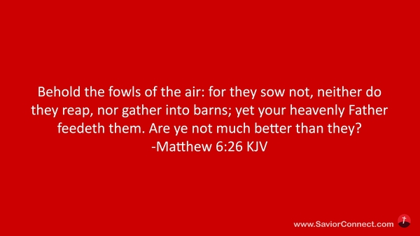 Behold the fowls of the air: for they sow not, neither do they reap, nor gather into barns; yet your heavenly Father feedeth them. Are ye not much better than they? -Matthew 6:26 KJV