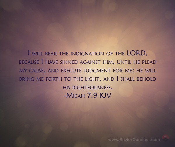 I will bear the indignation of the LORD, because I have sinned against him, until he plead my cause, and execute judgment for me: he will bring me forth to the light, and I shall behold his righteousness. -Micah 7:9 KJV