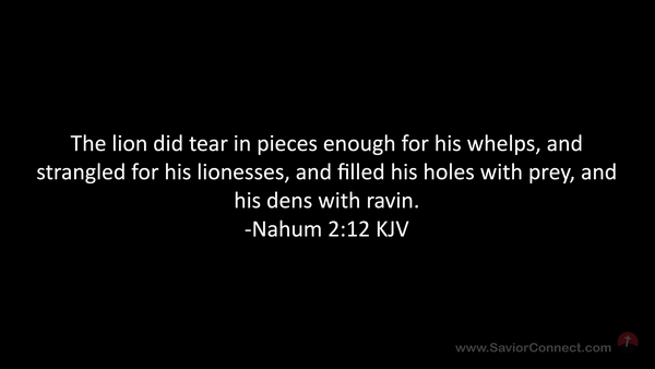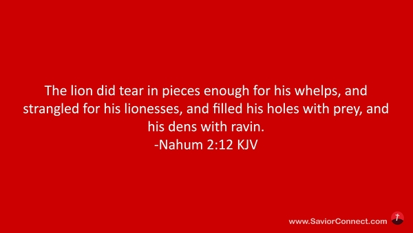 The lion did tear in pieces enough for his whelps, and strangled for his lionesses, and filled his holes with prey, and his dens with ravin. -Nahum 2:12 KJV