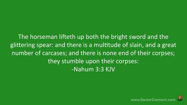 The horseman lifteth up both the bright sword and the glittering spear: and there is a multitude of slain, and a great number of carcases; and there is none end of their corpses; they stumble upon their corpses: -Nahum 3:3 KJV