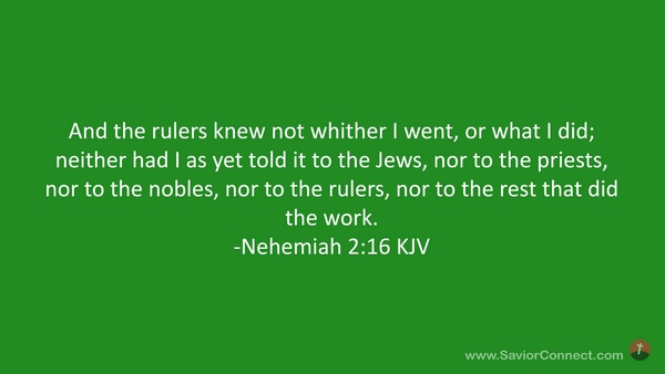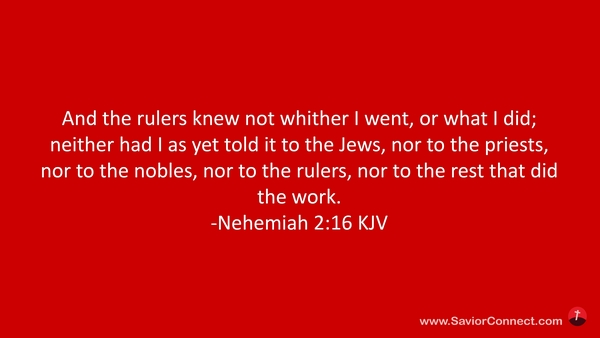 And the rulers knew not whither I went, or what I did; neither had I as yet told it to the Jews, nor to the priests, nor to the nobles, nor to the rulers, nor to the rest that did the work. -Nehemiah 2:16 KJV