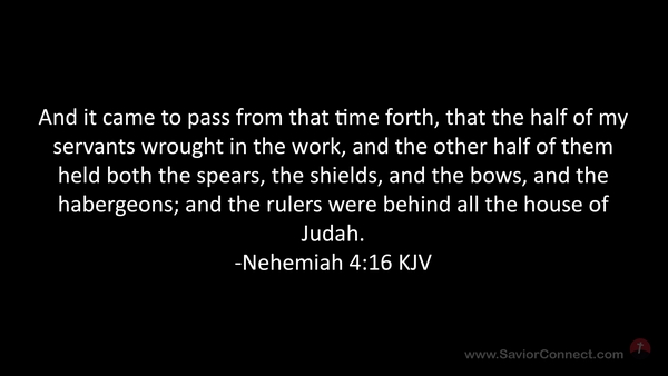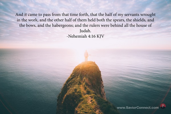 And it came to pass from that time forth, that the half of my servants wrought in the work, and the other half of them held both the spears, the shields, and the bows, and the habergeons; and the rulers were behind all the house of Judah. -Nehemiah 4:16 KJV