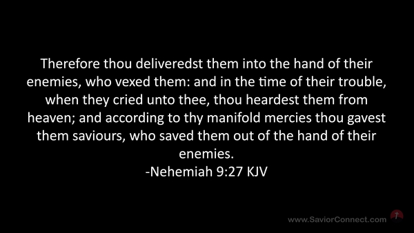 Therefore thou deliveredst them into the hand of their enemies, who vexed them: and in the time of their trouble, when they cried unto thee, thou heardest them from heaven; and according to thy manifold mercies thou gavest them saviours, who saved them out of the hand of their enemies. -Nehemiah 9:27 KJV