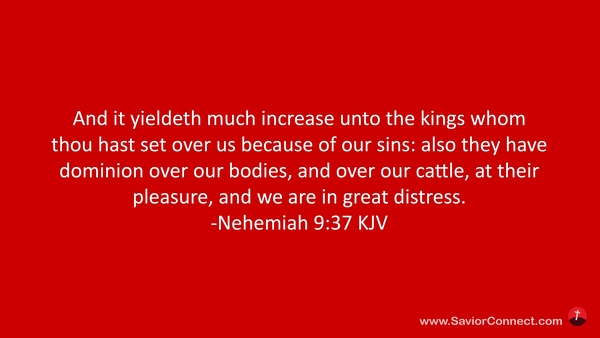 And it yieldeth much increase unto the kings whom thou hast set over us because of our sins: also they have dominion over our bodies, and over our cattle, at their pleasure, and we are in great distress. -Nehemiah 9:37 KJV