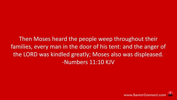 Then Moses heard the people weep throughout their families, every man in the door of his tent: and the anger of the LORD was kindled greatly; Moses also was displeased. -Numbers 11:10 KJV