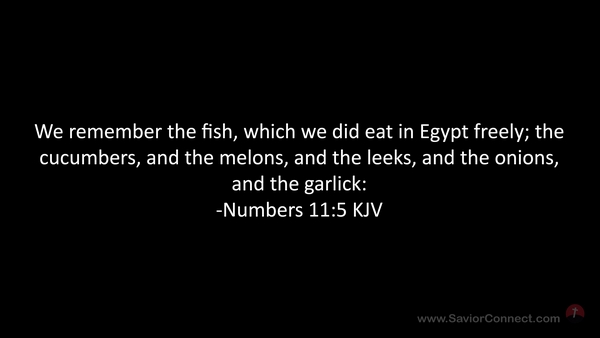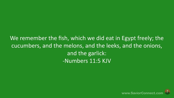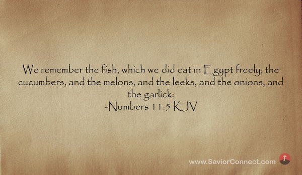 We remember the fish, which we did eat in Egypt freely; the cucumbers, and the melons, and the leeks, and the onions, and the garlick: -Numbers 11:5 KJV