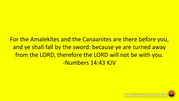 For the Amalekites and the Canaanites are there before you, and ye shall fall by the sword: because ye are turned away from the LORD, therefore the LORD will not be with you. -Numbers 14:43 KJV