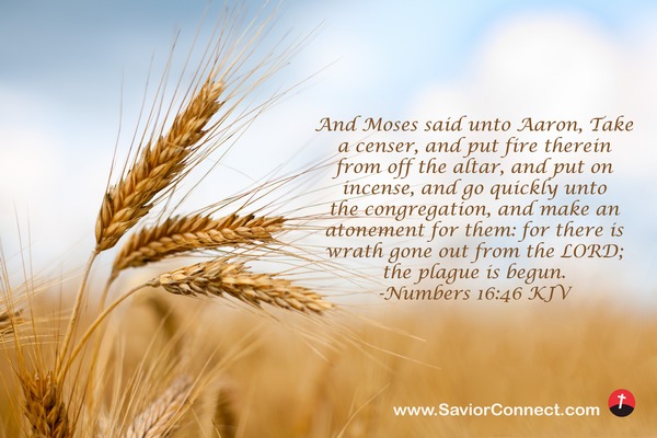 And Moses said unto Aaron, Take a censer, and put fire therein from off the altar, and put on incense, and go quickly unto the congregation, and make an atonement for them: for there is wrath gone out from the LORD; the plague is begun. -Numbers 16:46 KJV