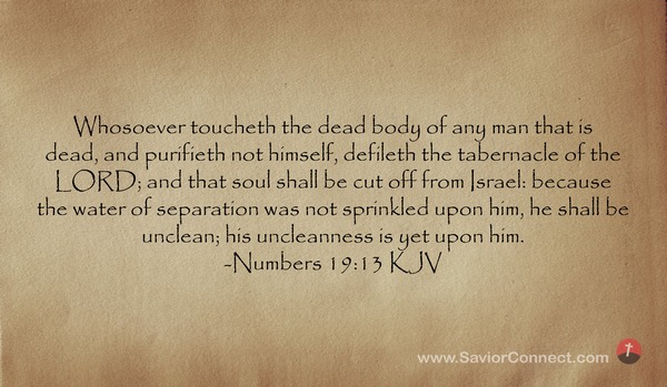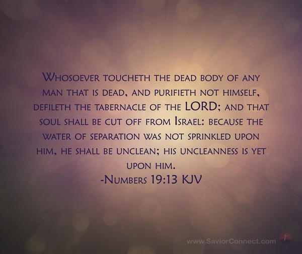 Whosoever toucheth the dead body of any man that is dead, and purifieth not himself, defileth the tabernacle of the LORD; and that soul shall be cut off from Israel: because the water of separation was not sprinkled upon him, he shall be unclean; his uncleanness is yet upon him. -Numbers 19:13 KJV